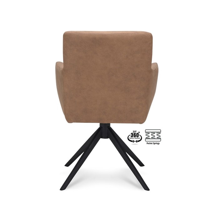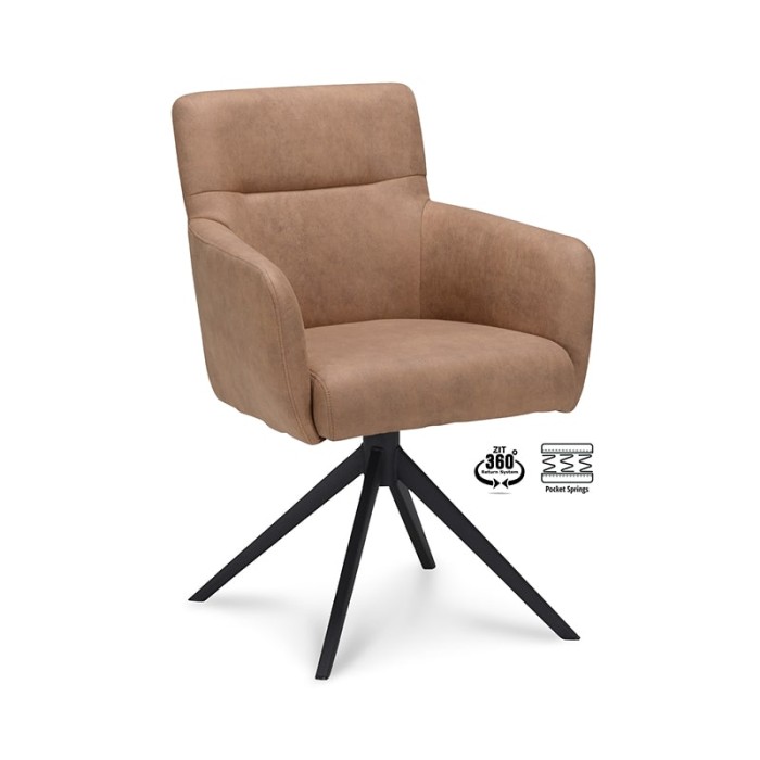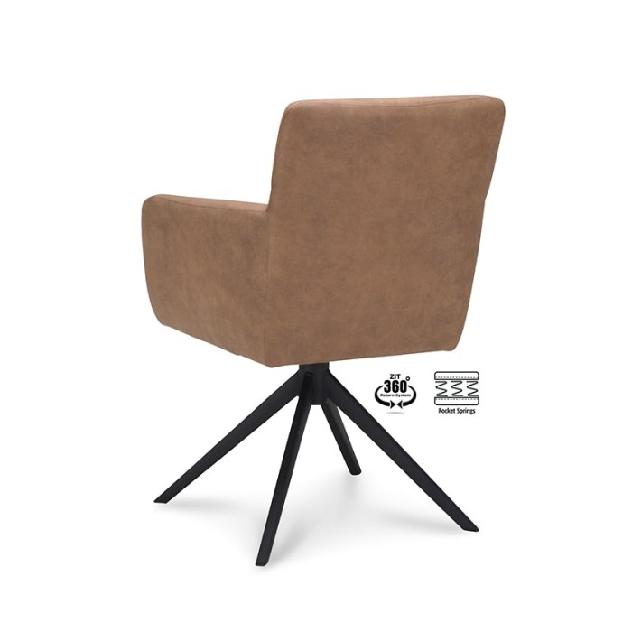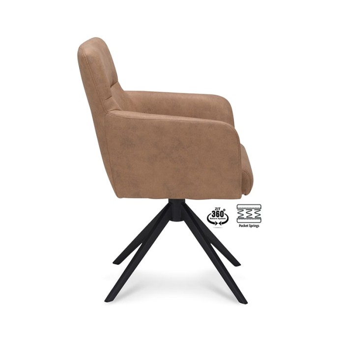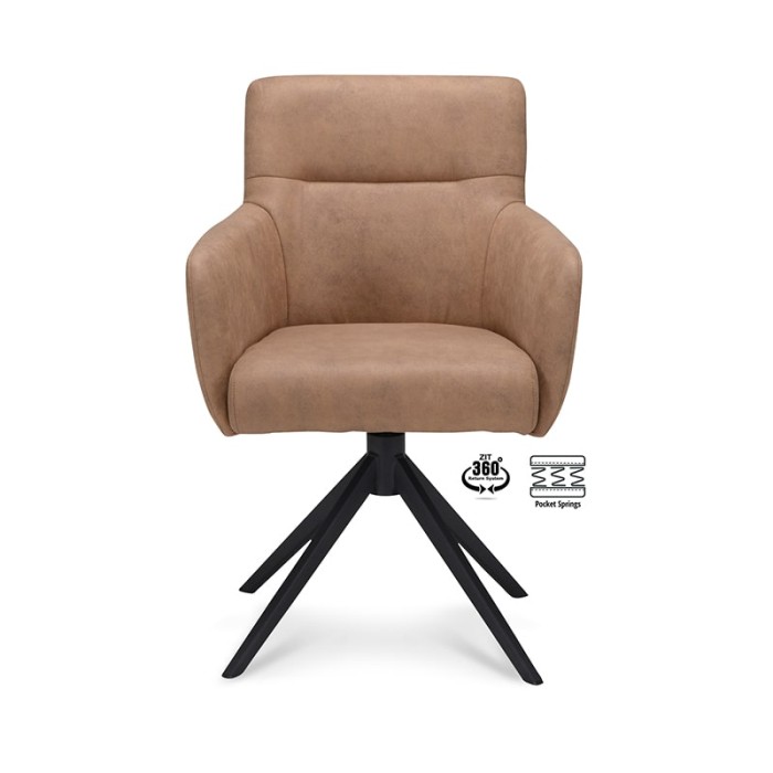 De Haluta armstoel Mees is een comfortabele en moderne armstoel met praktische draaifunctie, uitgevoerd in Cowboy Mocca stof en voorzien van een stijlvol zwart onderstel. Dankzij het 360° return-systeem draait de stoel automatisch terug naar de oorspronkelijke stand, wat ideaal is voor dynamische woon- of werkomgevingen.
